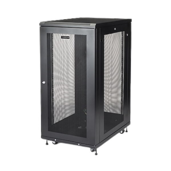 The cabinet includes secure locking doors, adjustable mounting rails, and efficient cable management options, ensuring your equipment remains organized, protected, and easily accessible.